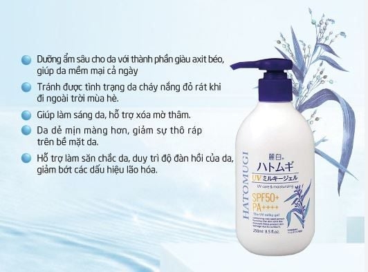 Bạn đang tìm kiếm một sản phẩm dưỡng da hàng ngày vừa dưỡng ẩm, làm sáng da, vừa bảo vệ da khỏi tác hại của tia UV? Sữa dưỡng chống nắng trắng da Hatomugi Ý Dĩ 250ml SPF50+ chính là lựa chọn hoàn hảo. Với chiết xuất từ hạt ý dĩ tự nhiên kết hợp công thức chống nắng phổ rộng SPF50+, sản phẩm giúp nuôi dưỡng làn da mềm mại, sáng khỏe và bảo vệ da toàn diện dưới ánh nắng mặt trời.