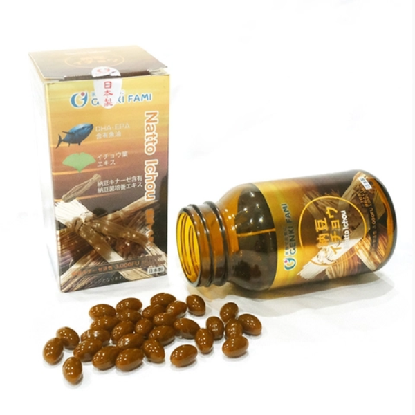Genkifami Natto Ichou là viên uống hỗ trợ ngăn ngừa đột quỵ và tai biến mạch máu não từ Nhật Bản. Kết hợp enzyme Nattokinase từ đậu nành lên men và chiết xuất lá bạch quả (Ginkgo Biloba). Sản phẩm giúp làm tan cục máu đông, tăng lưu thông máu lên não, cải thiện trí nhớ, giảm đau đầu và hoa mắt chóng mặt.
