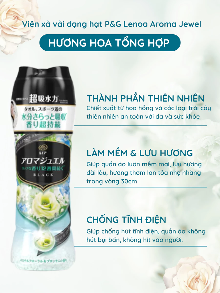 Lưu hương bền lâu: Tinh thể hương hoa tươi mát, dịu nhẹ, giữ mùi thơm nhiều giờ.